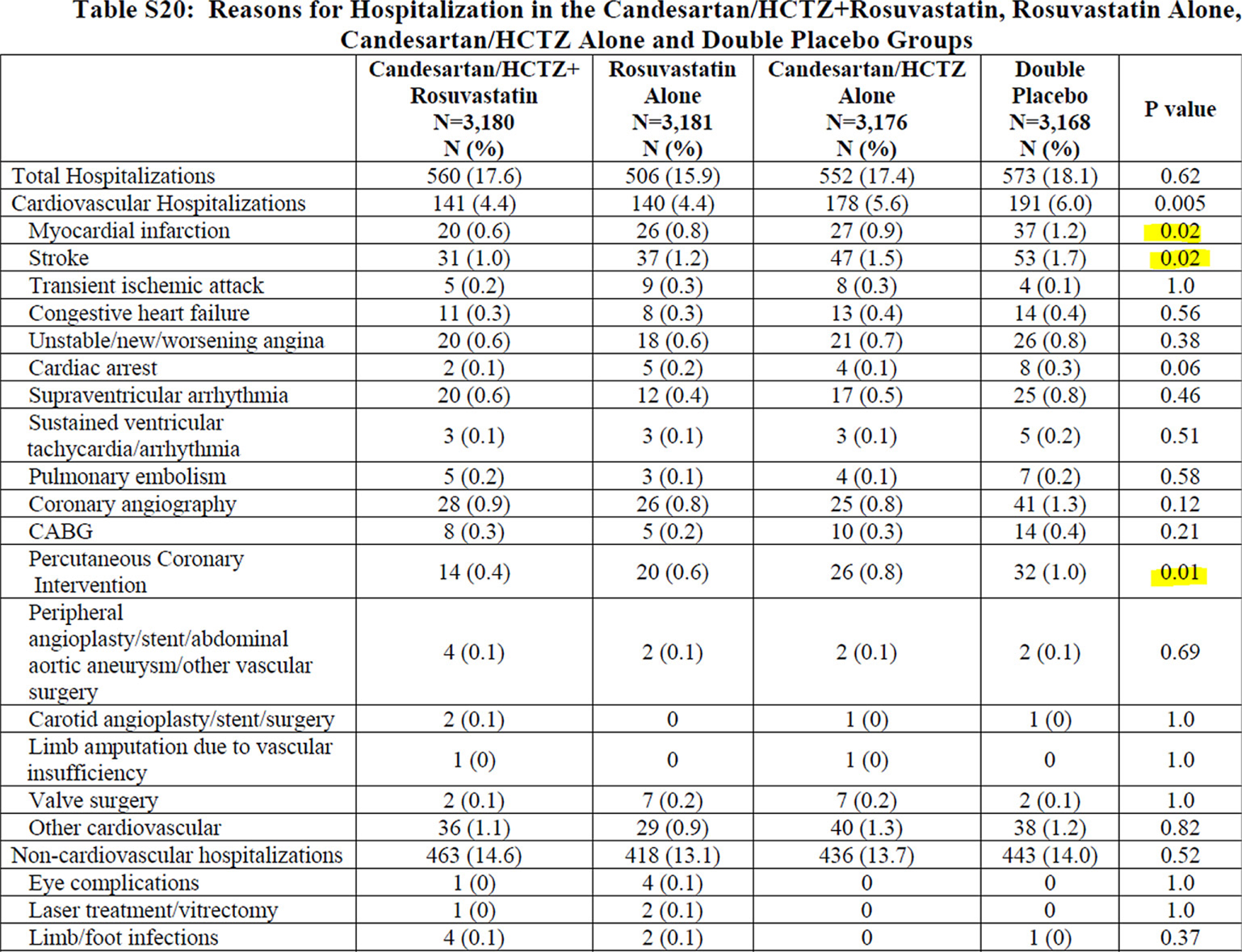 As done by the authors, it is of course possible to present the results as a two-group rather than a four-group comparison, pooling the data from all the patients taking rosuvastatin (with or without antihypertensive) and comparing them with all the patients taking placebo (with or without antihypertensive). This means comparing two groups of roughly 6200 patients each, rather than four groups of 3100 each, obviously considerably increasing the power of the analyses. On the contrary, as mentioned by the investigators (6), comparing two groups (instead of four) remains only possible in the case of absence of interaction between cholesterol and blood pressure-lowering treatments. However, this cannot be stated as true as we see a clear interaction between treatments for at least three major components (myocardial infarction, stroke, and percutaneous coronary intervention) of the two CPOs (see Figure 1, reproducing Table S20 in the Supplementary materials) (6).