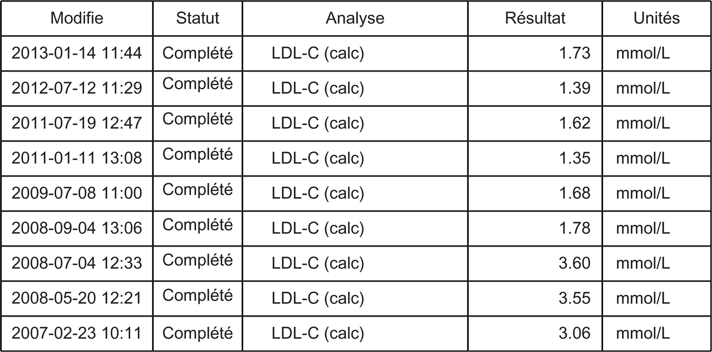 As an example, we reproduce in Figure 2 a real-world document, easily obtained by one of the authors from the hospital medical data file of one of his patients participating in HOPE-3. The sustained drop in a participant’s LDL measurements from 3.5 mmol/L to 1.5 mmol/L strongly suggests his allocation to rosuvastatin. Unblinding is a major issue in the process of documenting and adjudicating nonfatal cardiovascular complications. Knowing whether a patient is receiving a supposedly superior treatment (compared with placebo) or not may significantly influence the way that the physicians report (and interpret) symptoms. In addition, if the patients themselves are unblinded, it will obviously influence the way they report possible symptoms. As an example, in case of light or atypical symptoms, patients might be simply reassured and not hospitalized for careful follow-up and investigation if cholesterol is low (and thus patients thought to receive a protective statin). By contrast, the same patients with high cholesterol (thought to receive a placebo) may be rapidly admitted to the coronary care unit and subjected to full investigation including coronary angiography and possibly to revascularization, depending on various subjective or objective parameters. Considering the very approximate definitions of nonfatal cardiac complications used in HOPE-3 as described above—with a particular emphasis on the case of missing biomarkers in the diagnosis of myocardial infarction added to the possibility for local investigators to decide whether symptoms are secondary to ischemia or not—the probability of having a spurious difference between groups for nonfatal events is very high. All the more in a commercial trial with most local investigators financially linked to the sponsor. These considerations taken together, we feel that HOPE-3 does not raise confidence in the internal and external validity of the reported data.