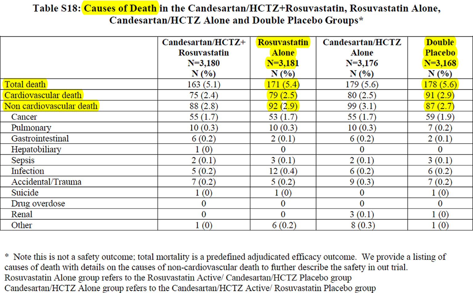 Actually, for the first CPO—the sum of cardiovascular deaths, nonfatal acute myocardial infarction (AMI), and stroke—as provided by the same table listing the results, the main manuscript states that there were 304 and 235 events in the placebo and the rosuvastatin group, respectively. However, these numbers differ from the sum of individual events constituting the 1st CPO, that is, 171 + 69 + 99 (total 339, placebo group) and 154 + 45 + 70 (total 269, rosuvastatin). This strongly suggests that the same numbers were not used in the main manuscript Table 1 and in the statistics, which, as already noted for the presentation of two instead of four groups, is misleading the readers. We obviously express serious concerns about this.