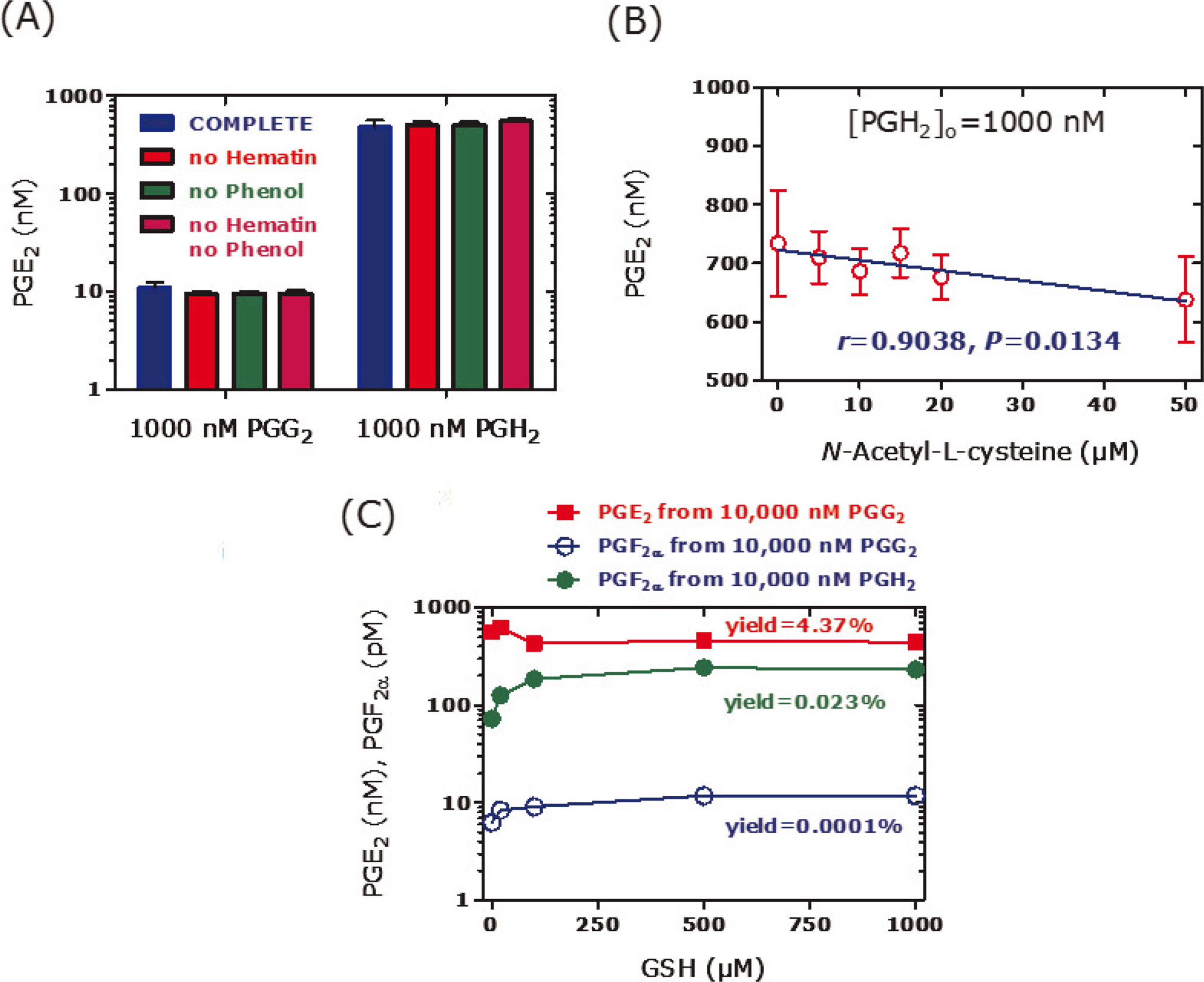 Figure 2. Formation of PGE2 and PGF2α from synthetic PGG2 and PGH2 in buffer at 37°C after incubation for 10 min. (a) Each 1000 nM of PGG2 and PGH2 were incubated in complete buffer (2 mM phenol, 1 µM hematin), as well as in the absence of phenol, of hematin or of both. (b) Effect of various concentrations of N-acetyl-L-cysteine (0–50 µM) on the formation of PGE2 from synthetic PGH2 used at a nominal concentration of 1000 nM in complete buffer. (c) Effect of reduced glutathione (GSH) used at various concentrations (0–1000 µM) on the formation of PGE2 from synthetic PGG2 and PGH2 used at a nominal concentration of 10,000 nM each in complete buffer. Experimental conditions and prostanoids analysis were as described elsewhere (3). Data are shown as mean and standard deviation of two independent experiments.