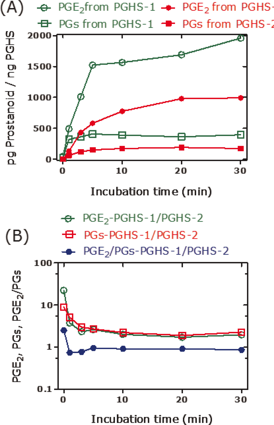 Figure 3. PGE2 and prostanoids (PGs, PGD2+15-keto-PGF2α+9ß,11α-PGF2α+PGF2α+8-iso-PGF2α) formed in incubation mixtures of arachidonic acid (10 µM), recombinant PGHS-1 (5 U), or recombinant PGHS-2 (5 U) at 37°C for the indicated time points. (a) Amount of PGE2 and PGs per pg PGHS-1 or pg PGHS-2. (b) Molar ratio of PGHS-1- to PGHS-2-derived PGE2, PGs, and their molar ratio. Experimental conditions and prostanoids analysis were as described elsewhere (3).