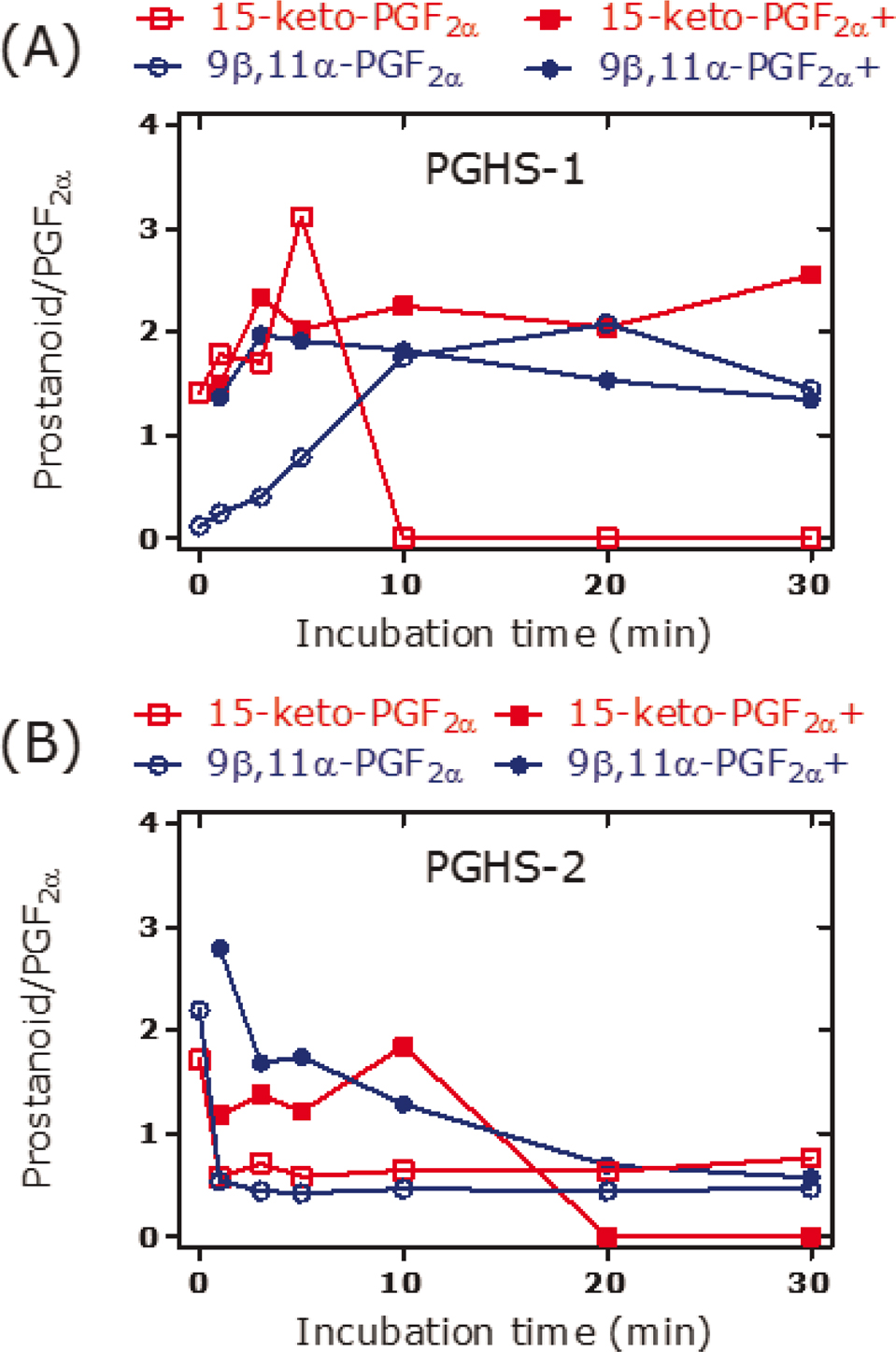 Figure 4. Molar ratio of the prostanoid 15-keto-PGF2α or 9ß,11α-PGF2α to PGF2α in incubation mixtures of arachidonic acid (10 µM) and (a) recombinant PGHS-1 (5 U) or (b) recombinant PGHS-2 (5 U) in the absence or in the presence (indicated by the symbol +) of N-acetyl-L-cysteine (100 µM) at 37°C for the indicated time points. Experimental conditions and prostanoids analysis were as described elsewhere (3).