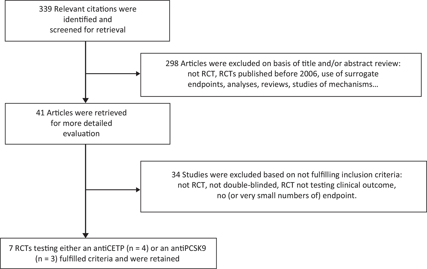 Figure 1. Flow diagram of selection of RCTs testing anti-CETP and anti-PCSK9 drugs.